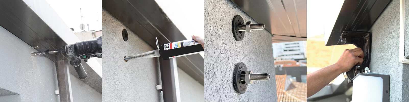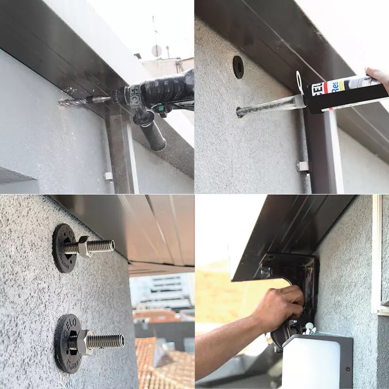 Das CELO Abstandsmontagesystem ResiTHERM® ist die innovative Lösung zur thermisch getrennten Befestigung im Wärmedämmverbundsystem (WDVS). Die Ankerstange mit dem glasfaserverstärkten thermischen Trennmodul bei ResiTHERM® 16 & 12 zieht sich selbstschneidend durch den Putz in den Dämmstoff, gewährleistet dabei zugleich einen perfekten Setzvorgang mit der chemischen Mörtelmasse und dichtet durch die EPDM-Dichtung sauber das Bohrloch ab. Das Ergebnis ist eine saubere Optik bei einem relativ kleinen Durchmesser der Abdeckscheibe. Der CELO ResiTHERM® 12 hält optimal für mittlere Lasten wie Leuchten, Briefkästen oder Regenfallrohre. Mit dem CELO ResiTHERM 16 und 37 werden schwere Lasten wie Markisen, Klimageräte und Satellitenanlagen in Beton, Porenbeton und Mauerwerk aus Loch- und Vollstein befestigt und garantieren einen sicheren Halt.