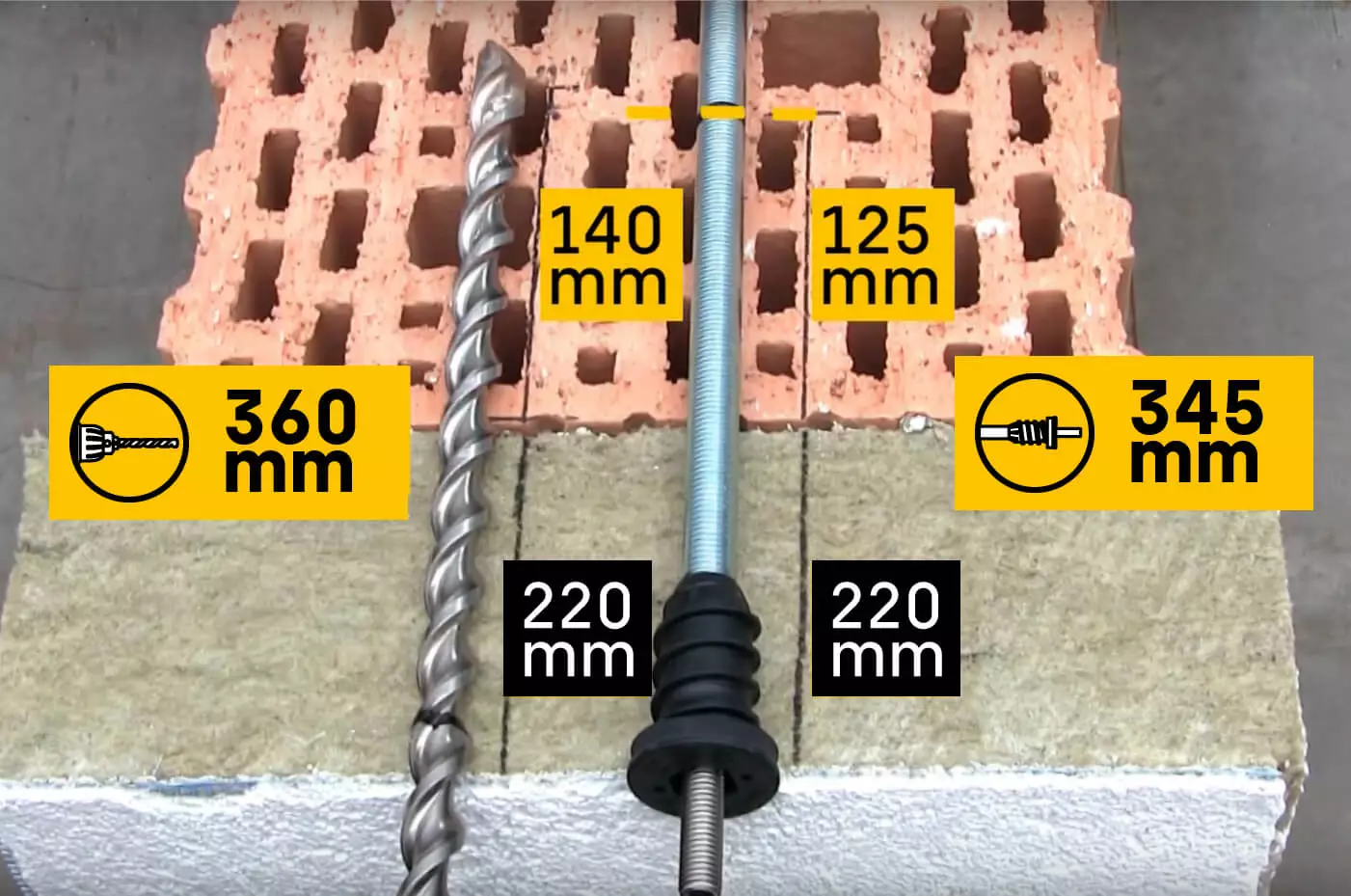 Bohrlochtiefe hier ≥ 140 mm + 220 mm ≥ 360 mm