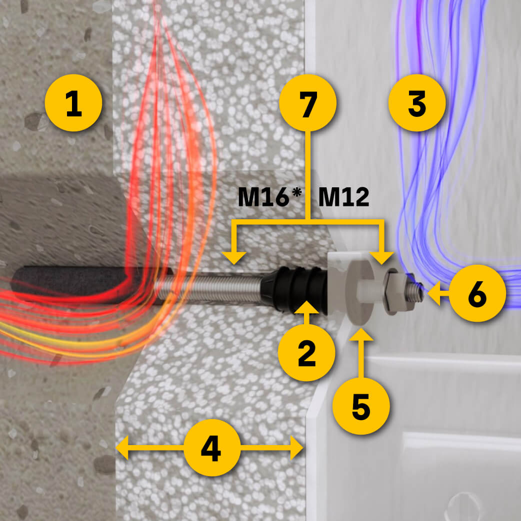 Die beiden Innovationsprodukte ResiTHERM® 16 und ResiTHERM® 12 unterscheiden sich durch den Durchmesser der in der Wand liegenden Gewindestange - M12 bei ResiTHERM® 12 im Gegensatz zur größeren Gewindestange M16 bei ResiTHERM® 16.