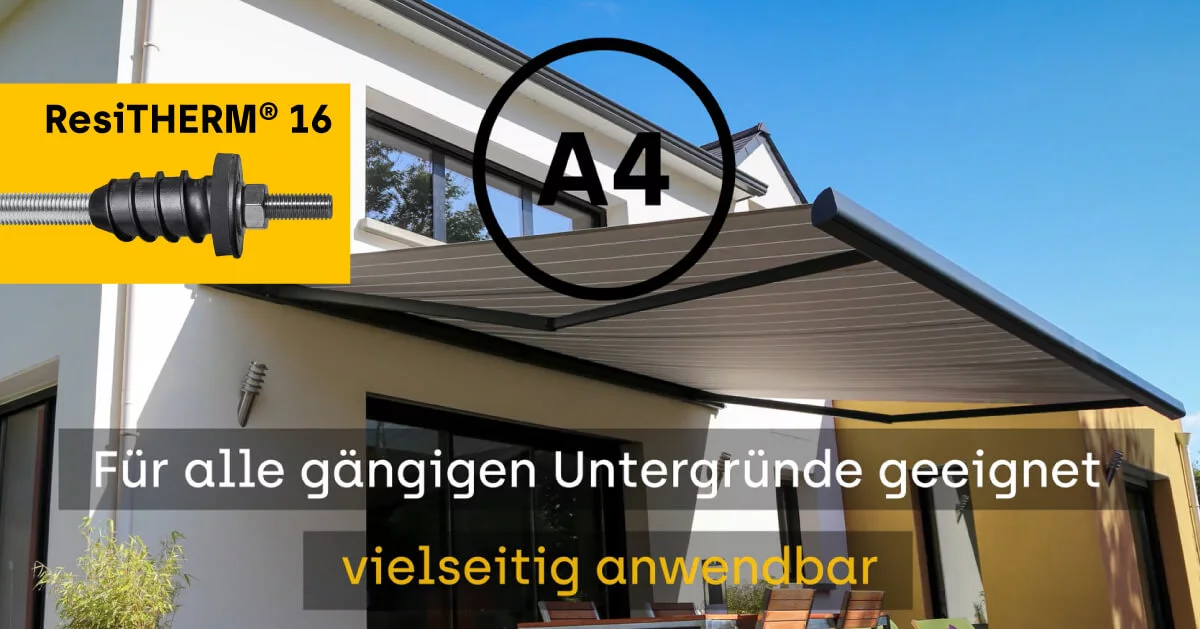 Mit dem Abstands-Montagesystem ResiTHERM® 16 lassen sich schwere Lasten wie Vordächer, Markisen, französische Balkone, Geländer oder Satellitenschüsseln sicher und zuverlässig an der Außendämmung befestigen - ohne Wärmebrücken.