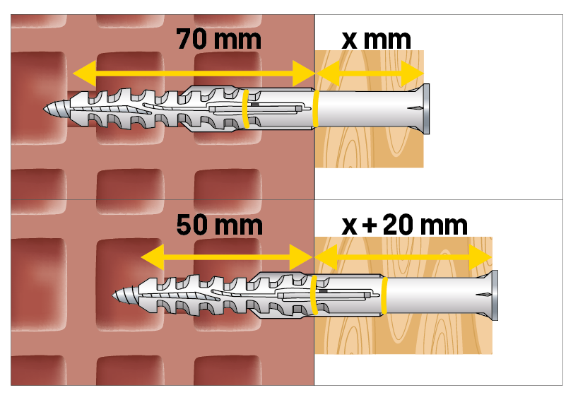 Weniger Lagerhaltung aufgrund der beiden Setztiefen, die eine Dübelgröße Multifunktionsrahmendübel MFR noch vielfältiger einsetzbar für verschiedene Anbauteilstärken machen.