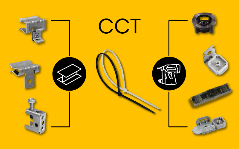 Der Kabelbinder CCT aus alterungs-, witterungs- und (schwarze Version) UV-beständigem Nylon ist CELOs beliebter Kabelbinder für die schnelle Elektrobefestigung an Metallträgern oder mit Gasnagler FORCE ONE.