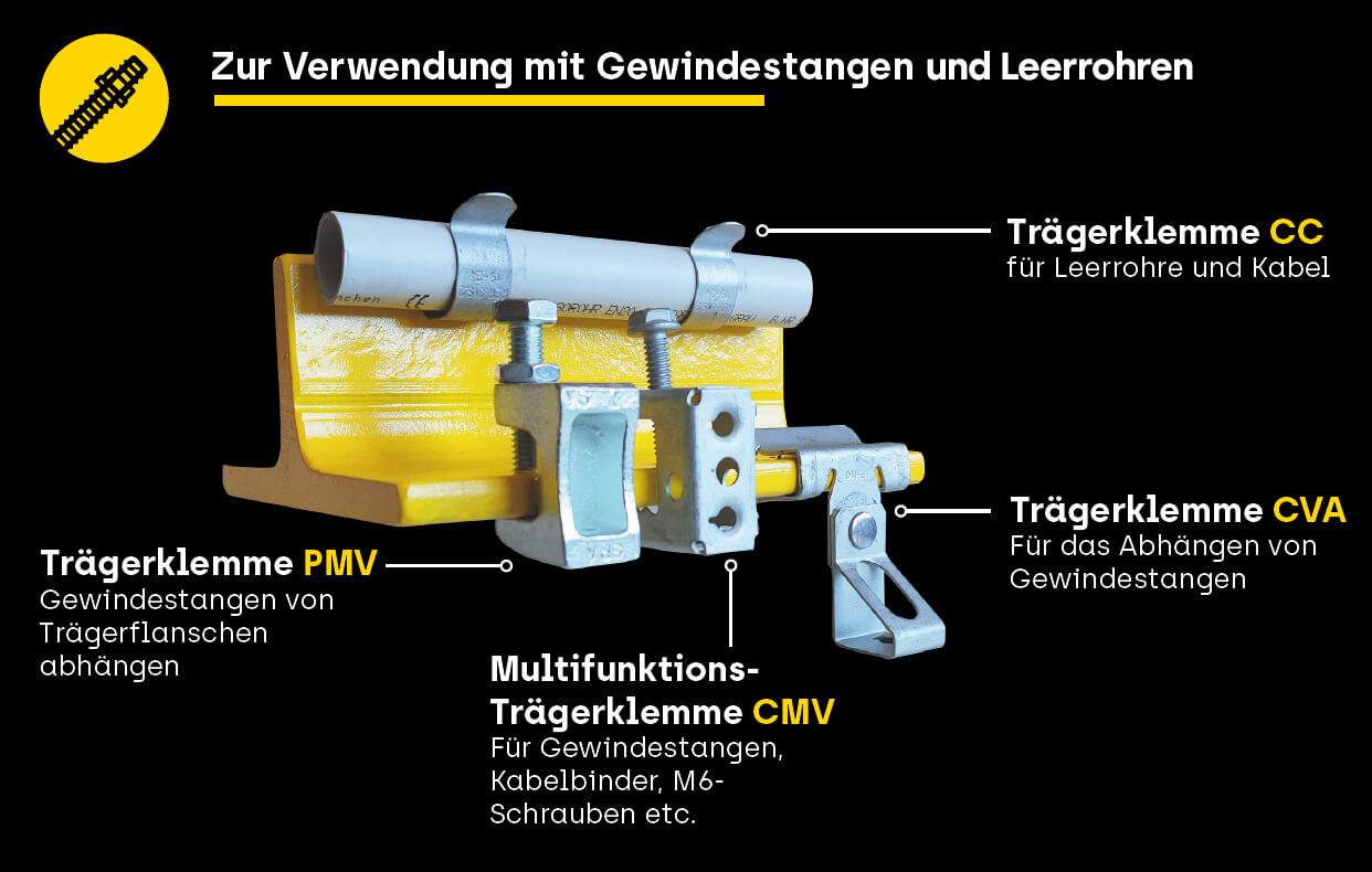 Mit Ankerstangen, Rohrschellen und Kabelbinder komplettierten Sie Ihre Trägerbefestigung.