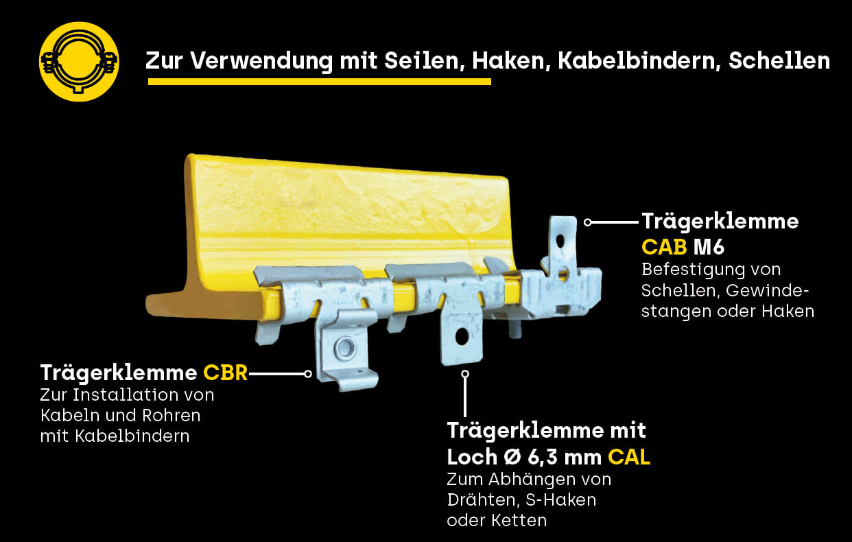 Trägerklemmen zur Verwendung mit Seilen, Haken, Kabelbindern, Schellen