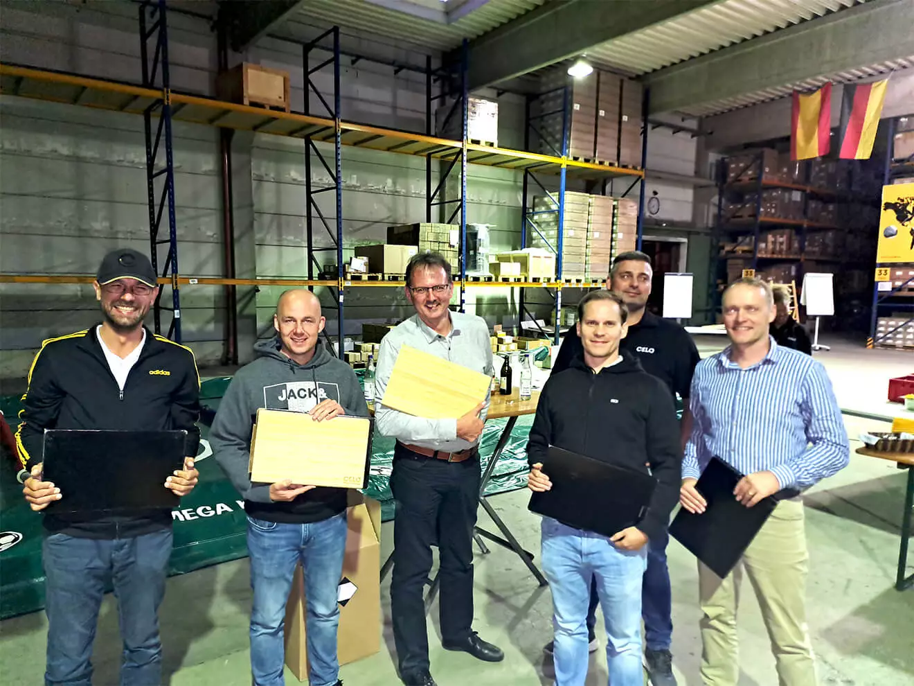 Die Zeit verging wie im Flug, und schon bald stand der Höhepunkt des Abends an: Die Siegerehrung der drei besten Teams des Menschenkicker-Turniers! Sie wurden mit tollen CELO-Geschenken belohnt: CELO-Thermosflaschen - ideal auch zum Kühlhalten für den Sommer, Bambus-Schneidebretter und coole Kühltaschen.